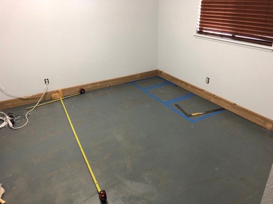 After painting, I pulled up the carpet and laid down the new flooring (stain & seal). In my mind, I had the Lowe’s hardware store flooring, but ended up with something a bit different. What should’ve been grey concrete with a slight sheen, ended up as a blue-grey stained floor that still showed some carpet glue lines (the acid wash didn’t work out well).