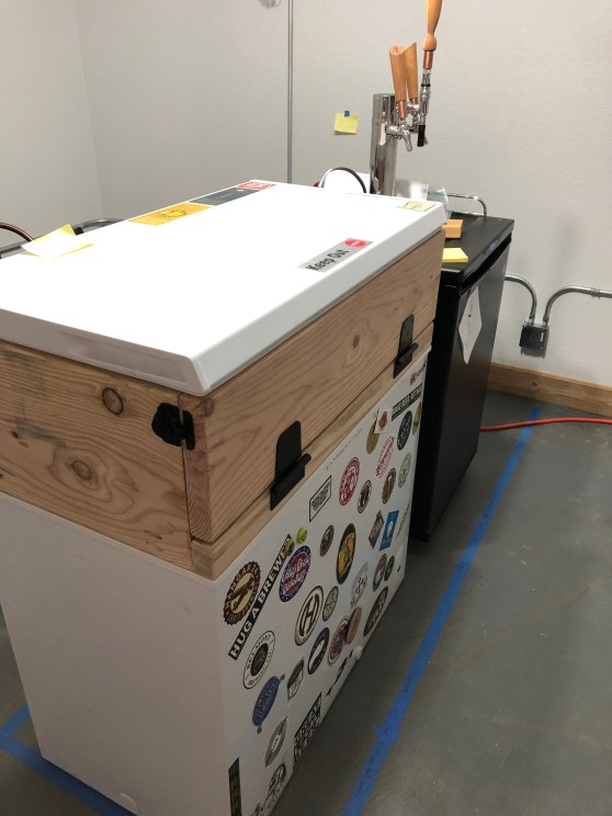 And finally, it was time to start bring my equipment in. I pulled in my kegerator (holds 3 corney kegs) and chest freezer (former fermentor) and planned my bar build. To start I needed to convert my fermenter into a keezer (kegerator/freezer conversion), so I could increase my service to 6 taps. But, why not go for 7 (possible).